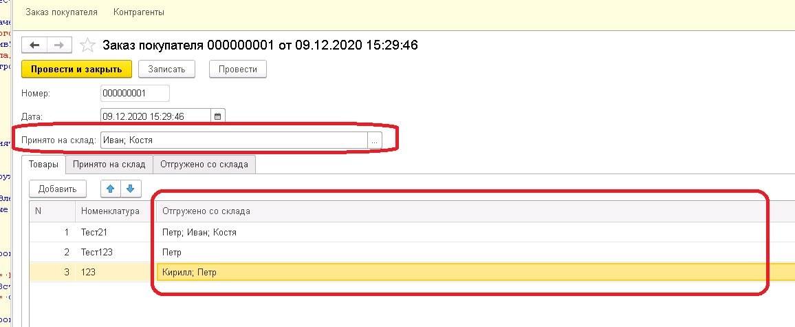Пример использования реквизита объекта и реквизита табличной части с типом Список значений.